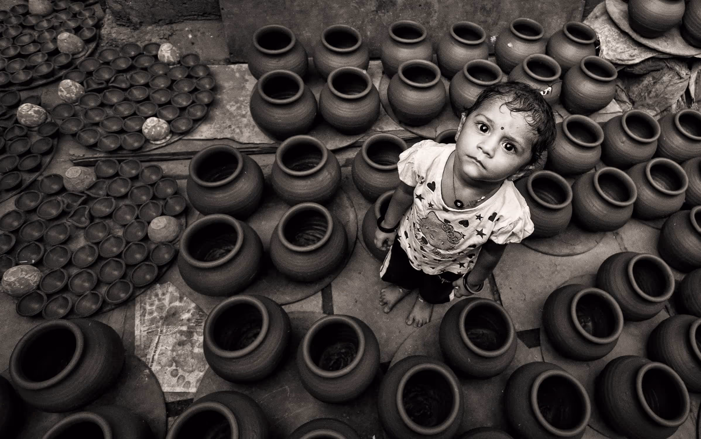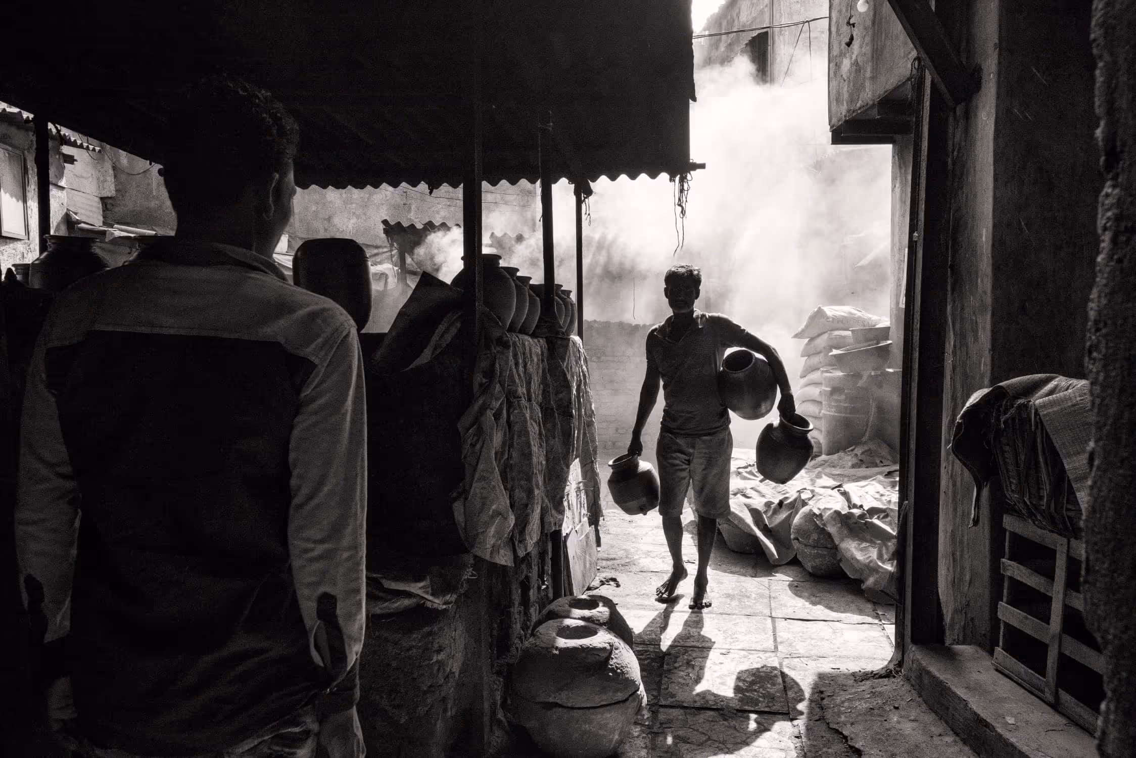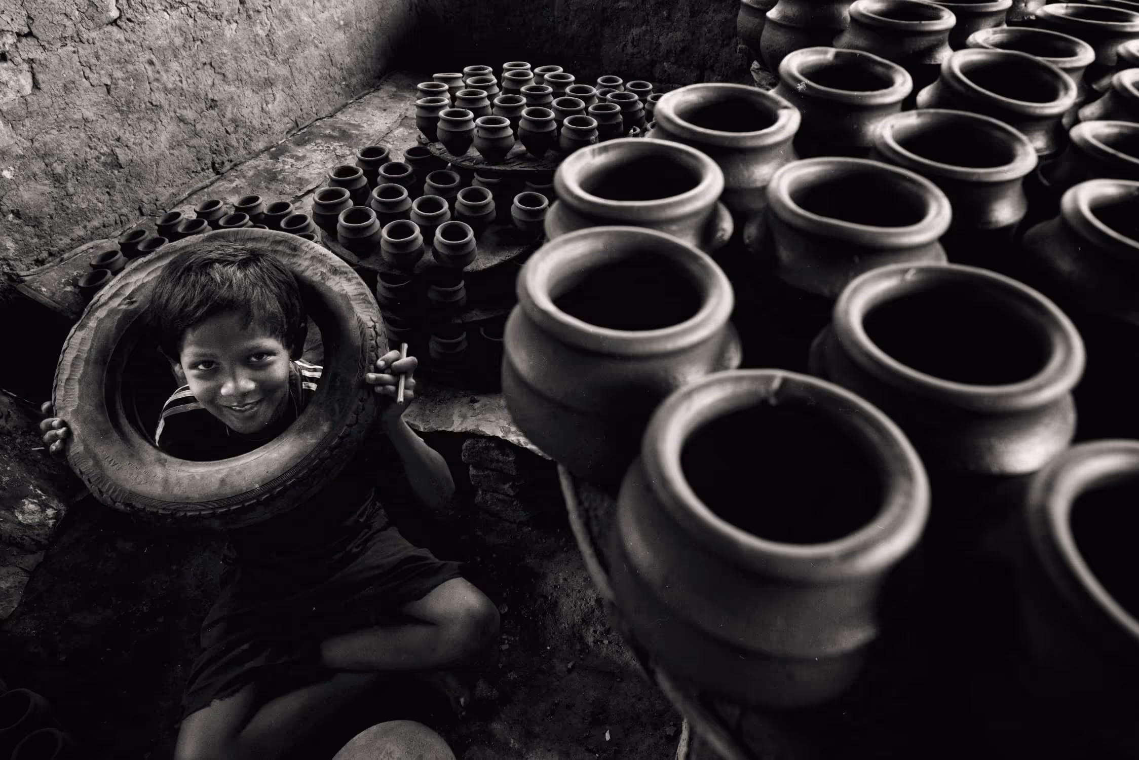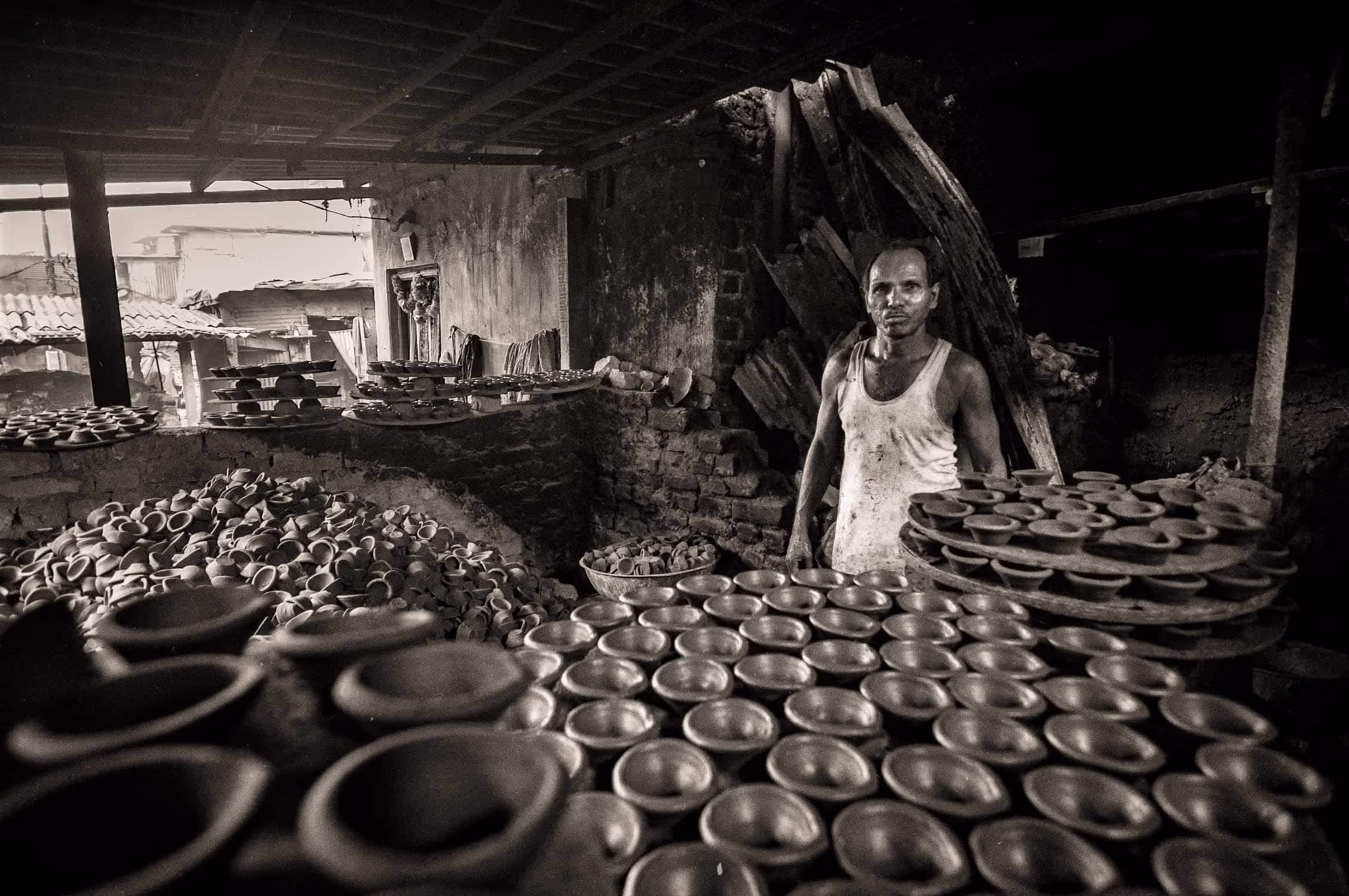 Kumbharwada in Dharavi (Mumbai, India) is an establishment of potters almost 100 years old. It is the largest community of potters in Mumbai. The potters originally come from Saurashtra, Gujarat state of India. 'Khumbars' means potter and 'Wada' means colony. Hence the name Kumbharwada – colony of potters. It occupies 22 acres of land that houses around 1400-1500 families, 700–800 of whom still practice pottery today. They still make use of traditional methods of pottery. They use indigenous red and grey clay and bake the molds in traditional kilns. They use waste forms and sheets of cardboards to light up the kilns. These clay products have simple designs and come in various shapes and sizes. Usually they make earthen pots, bowls and flower vases. The dramatic light flowing through the smoke from the furnace, varied shapes and forms along with the beautiful people residing in it making a living by this art have always amazed me.