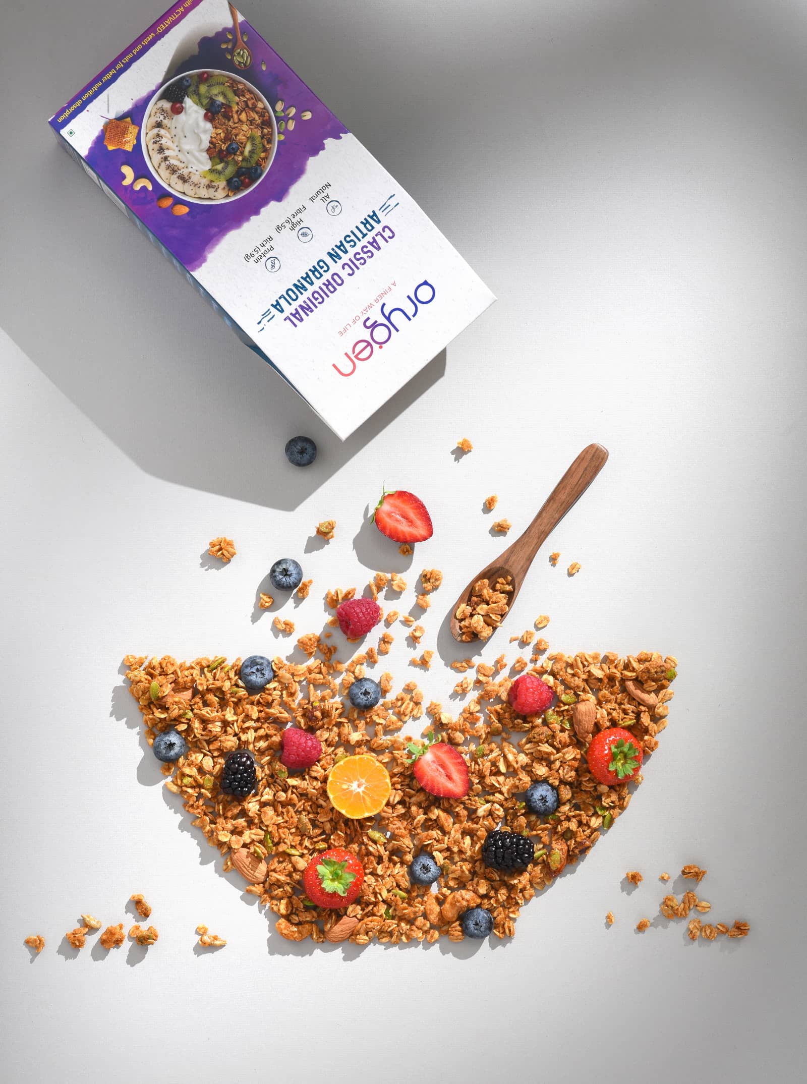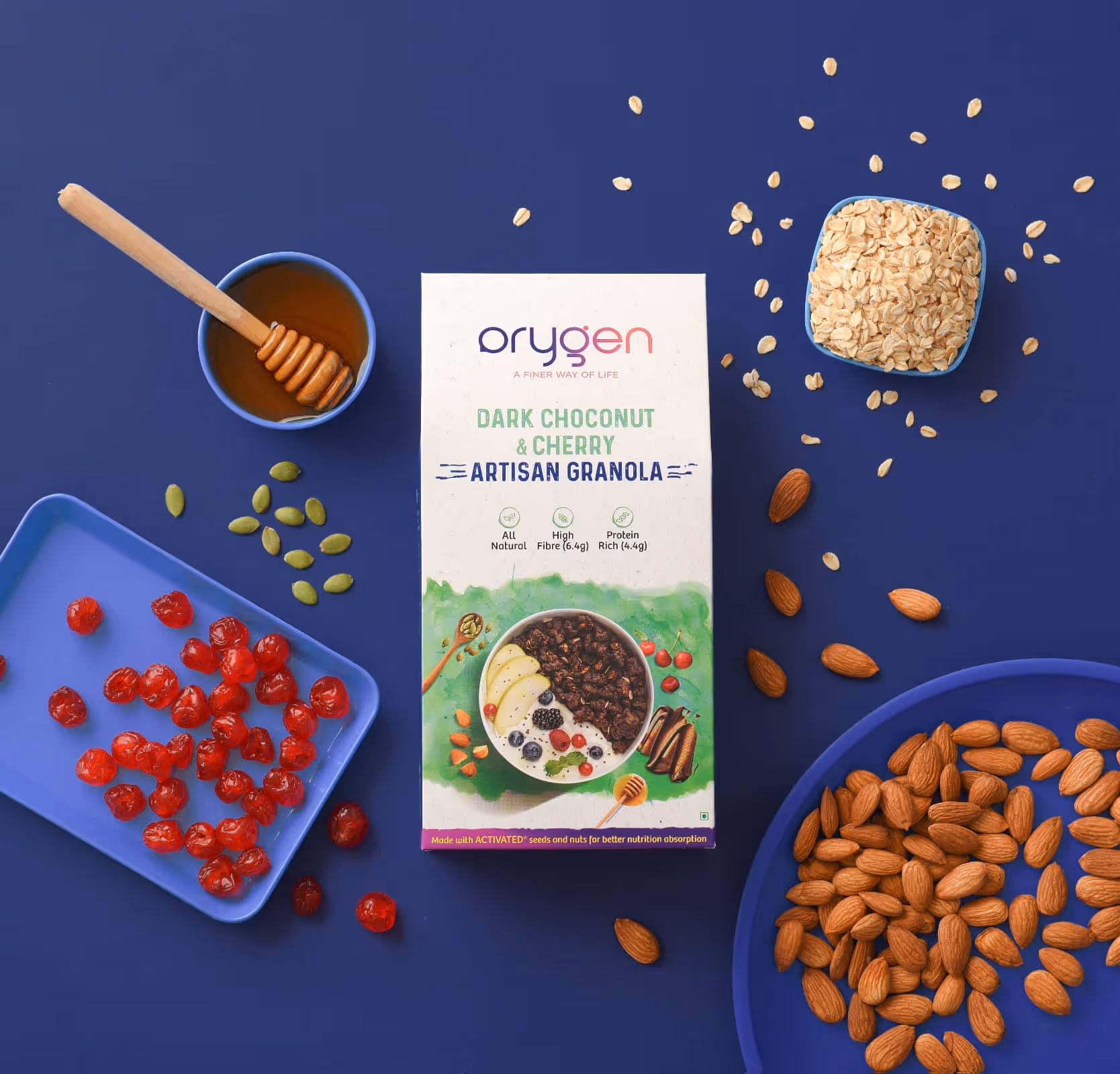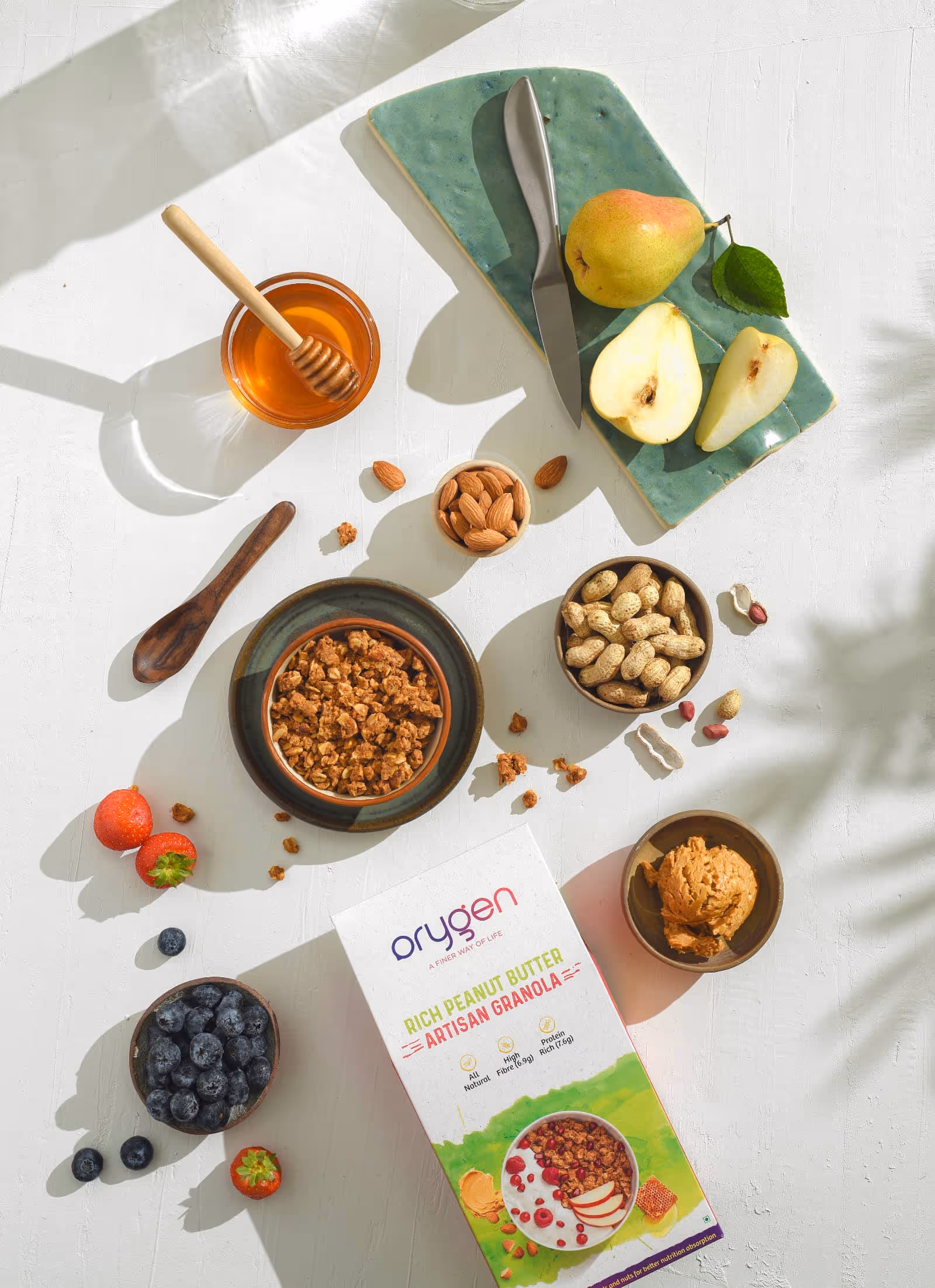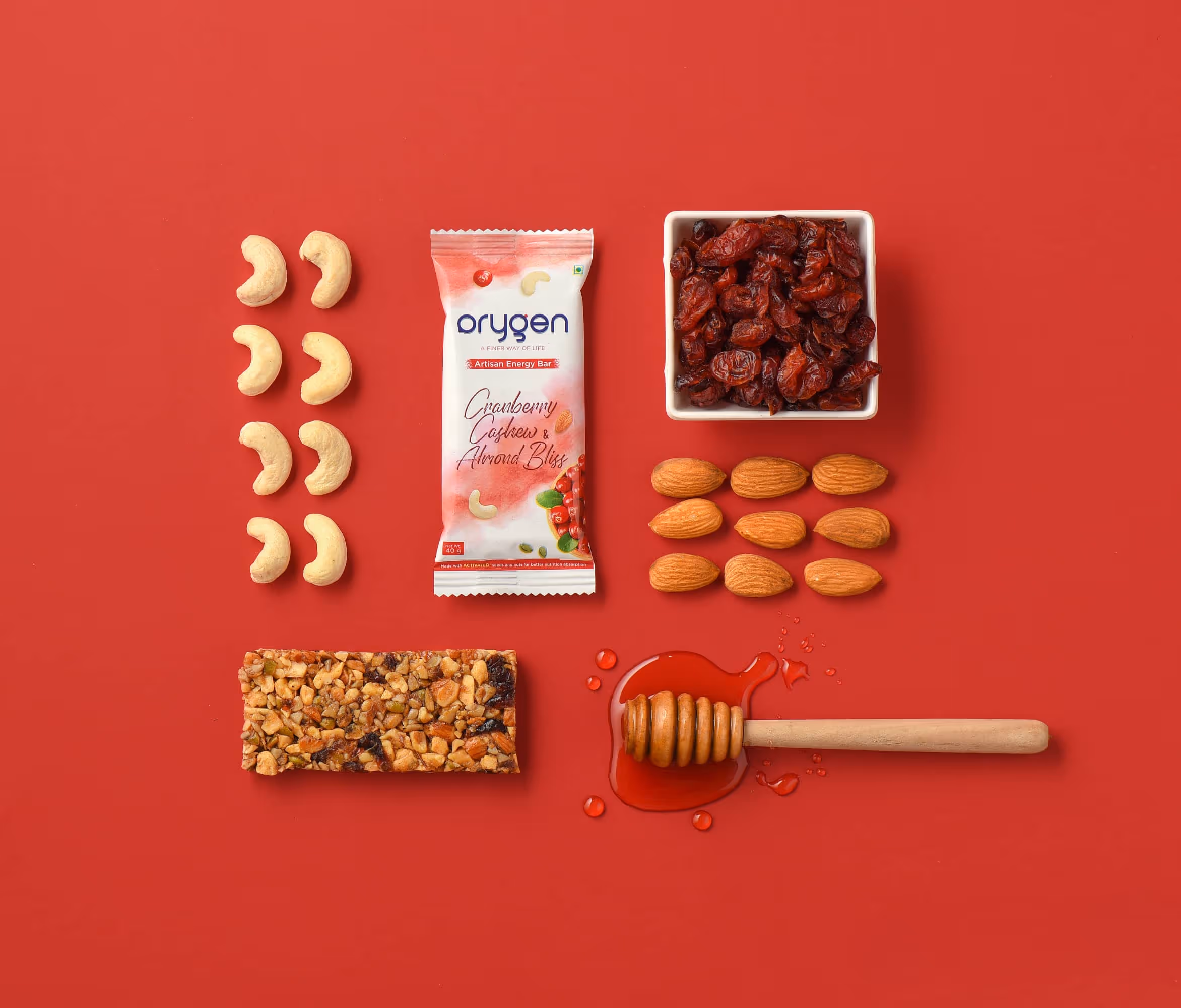 This series of images was shot for 'Orygen' brand dedicated to offering a finer approach to life and fitness. Their product range includes energy and protein bars, along with a variety of granolas, all made from all-natural ingredients and crafted to suit everyone. With fresh, vibrant ingredients set against colorful backdrops, styling and setting up each shot was an absolute delight!