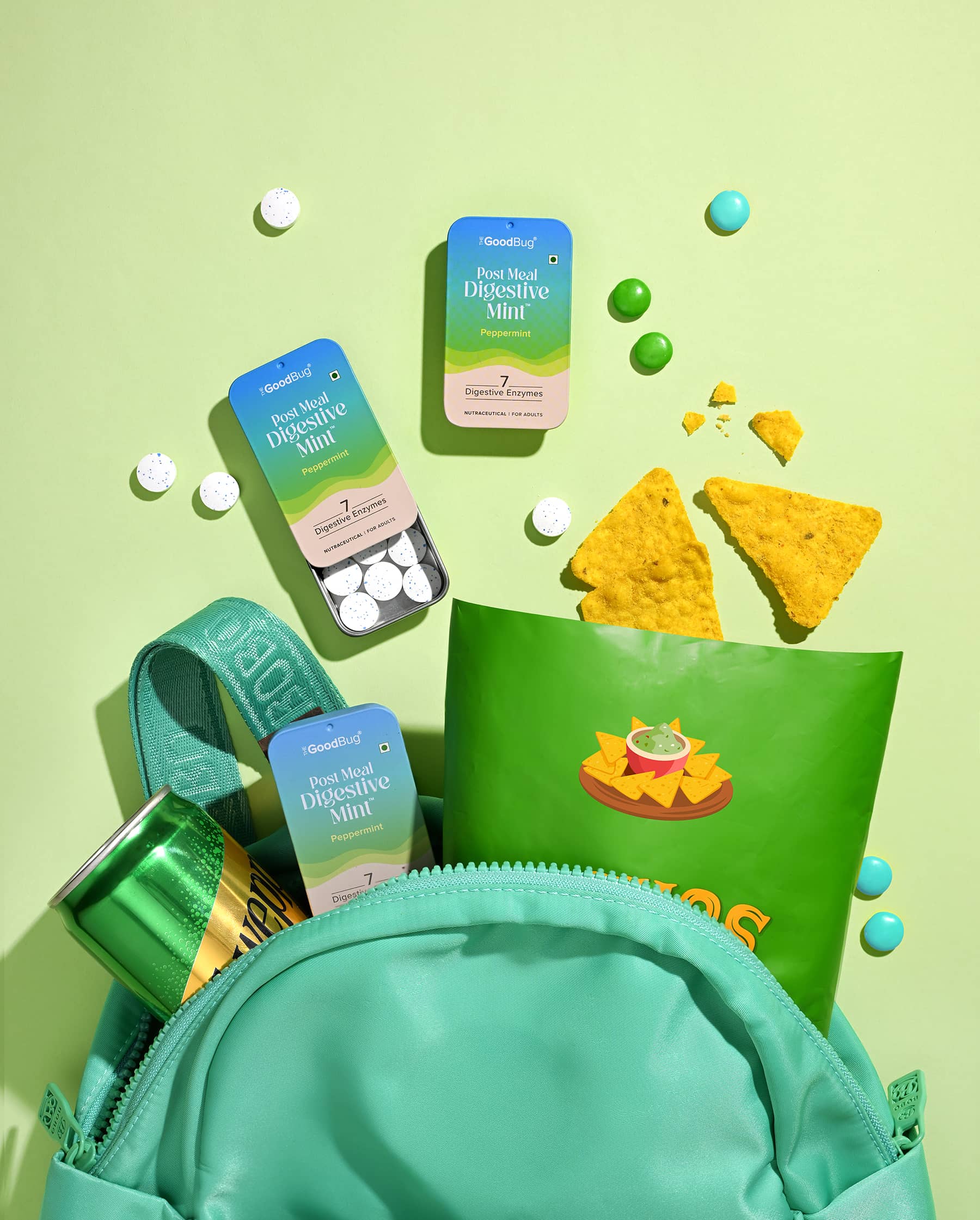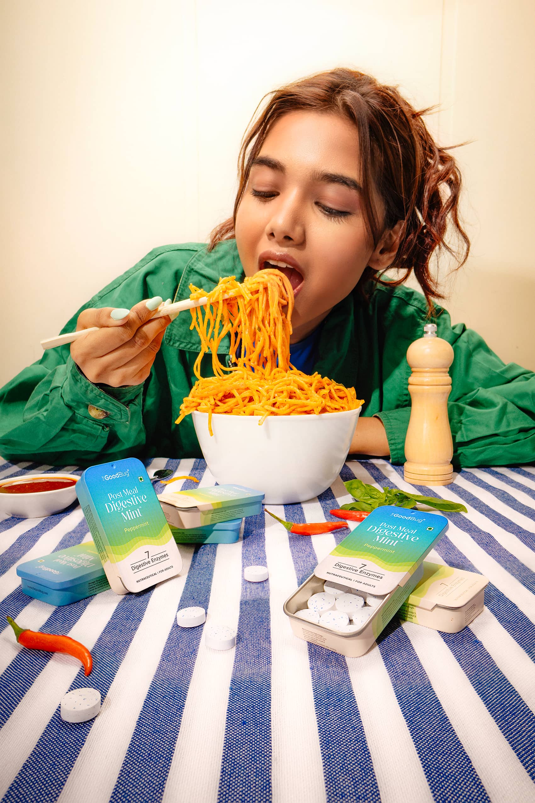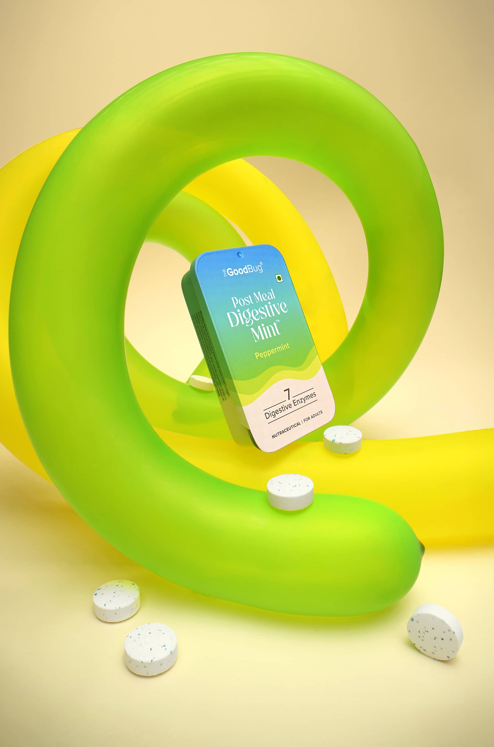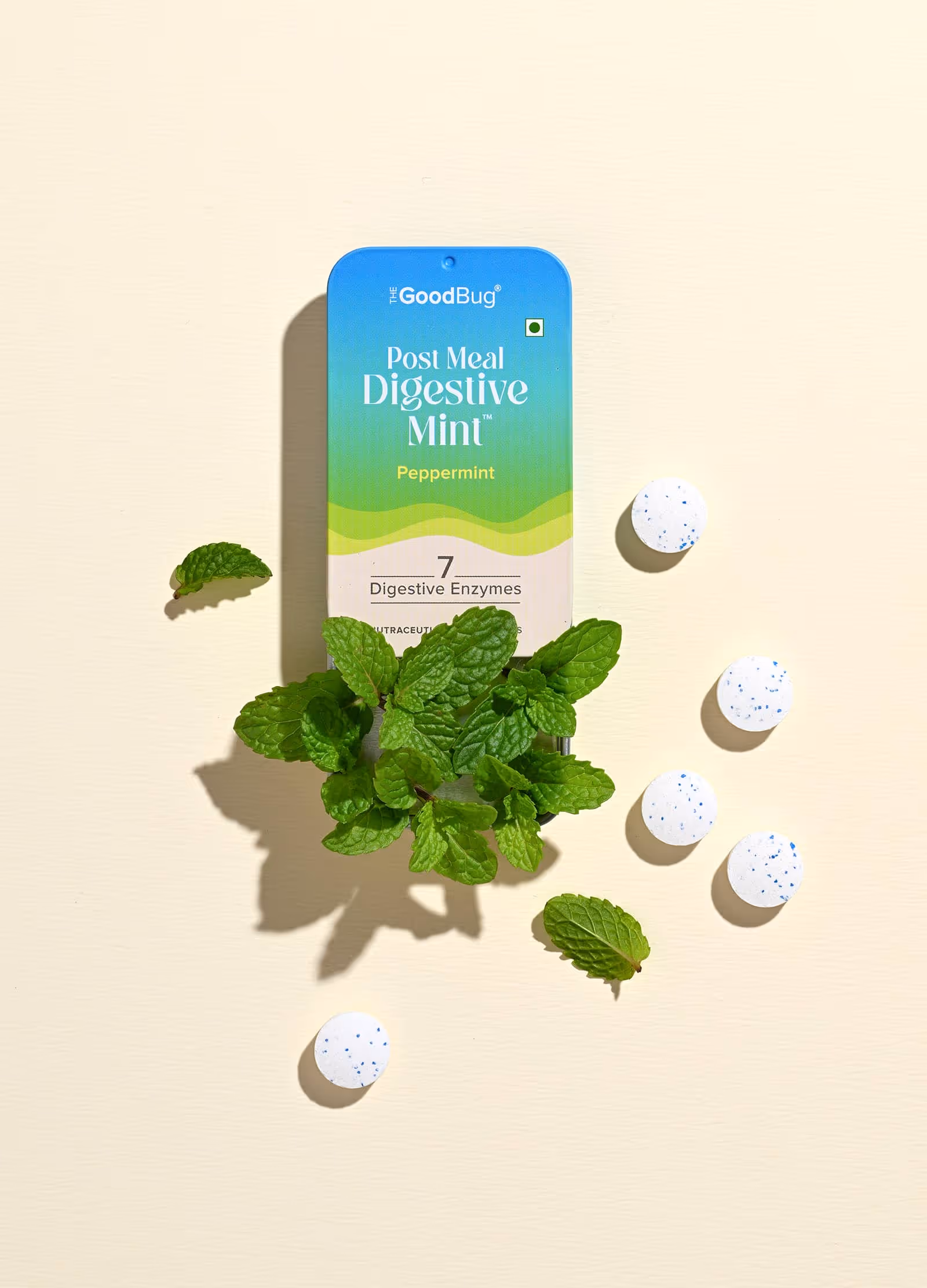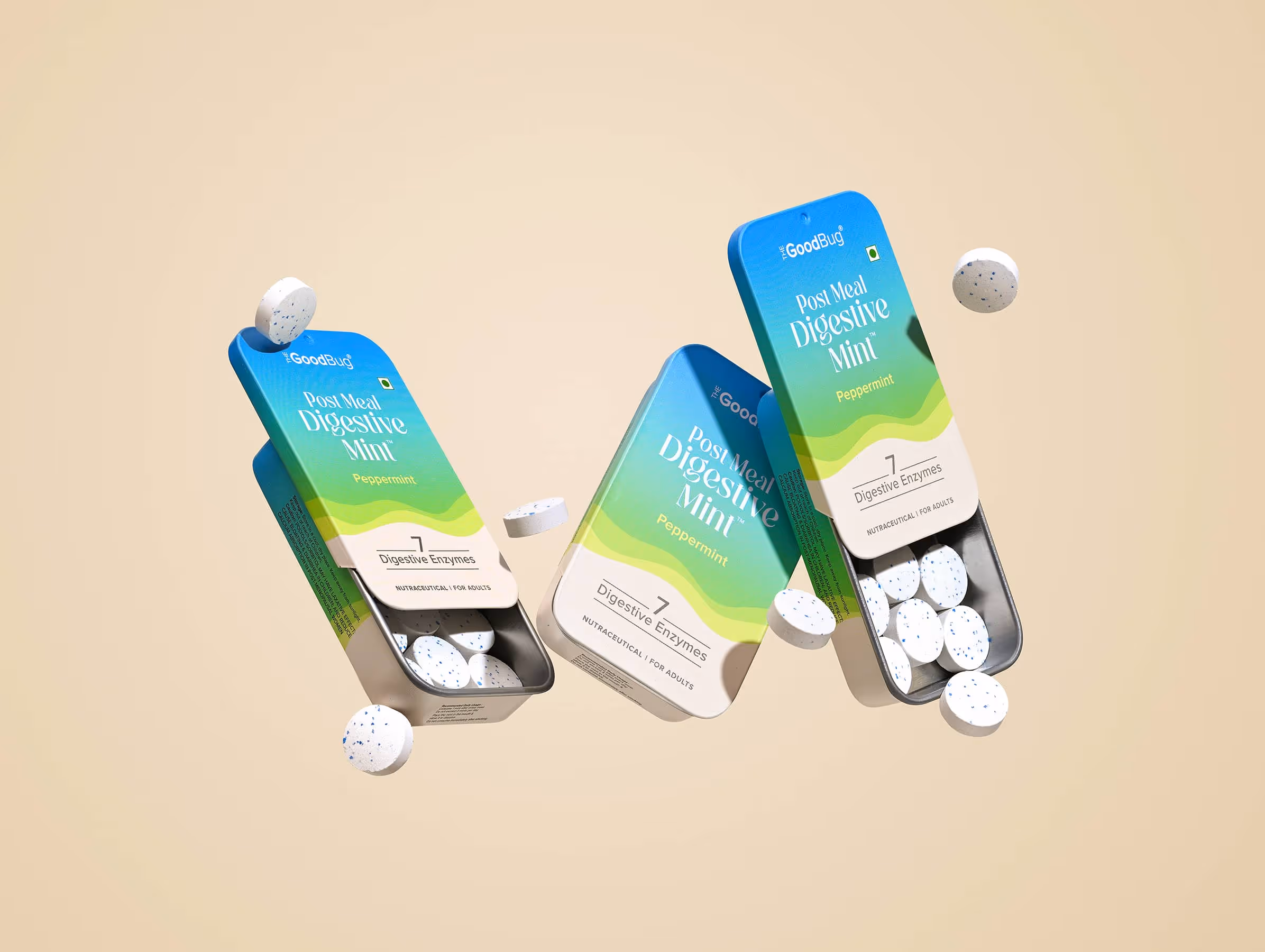 A super fun shoot for The Good Bug, an Indian health & wellness brand is all about happy guts. This series was styled and shot for their latest launch- 'Post-Meal Digestive Mints'. Beyond our classic product–ingredient frames, experimenting with quirky talent portraits and food pairings was hands down our favourite part!